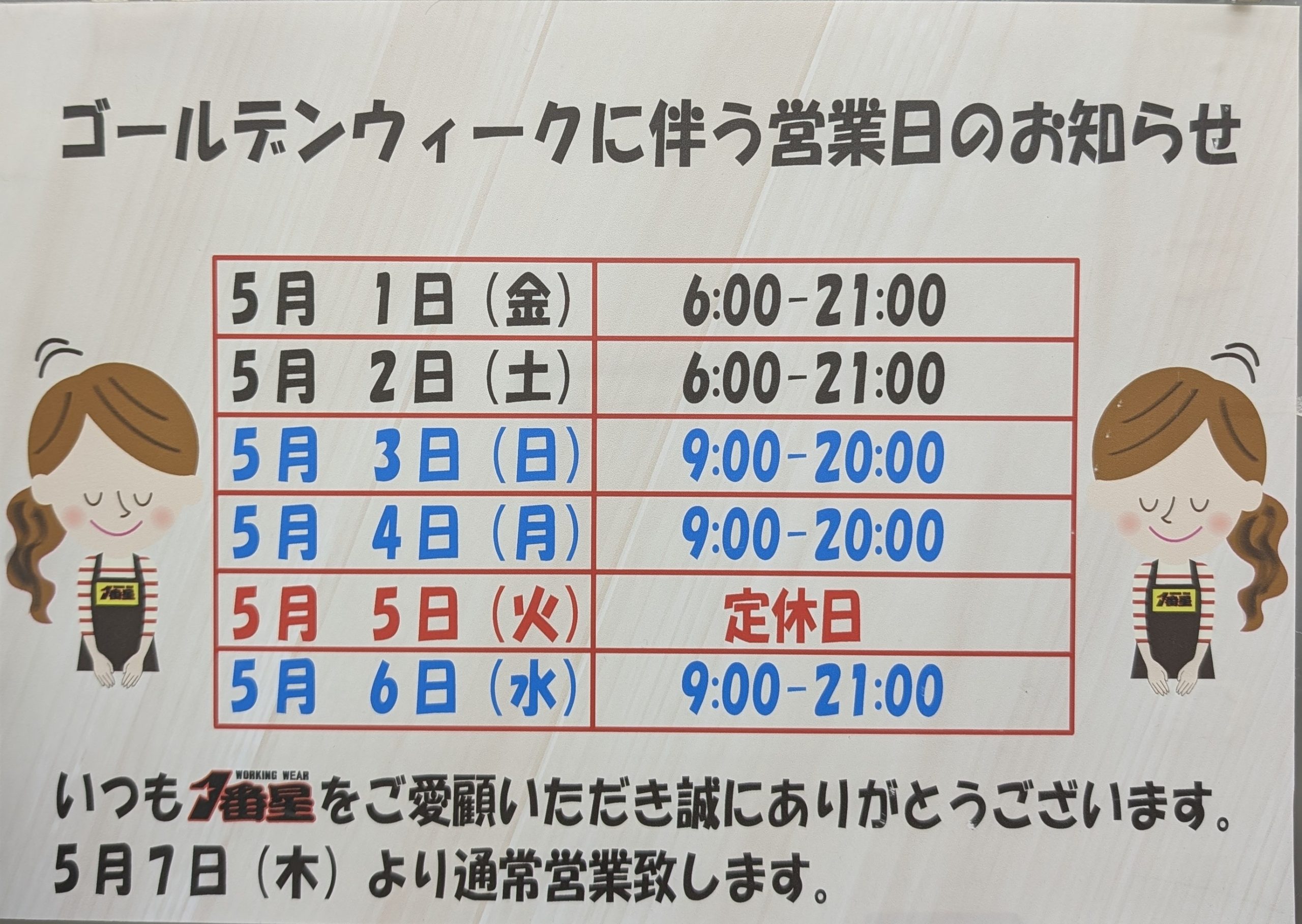 ★ 5月1・2日は6時から21時まで